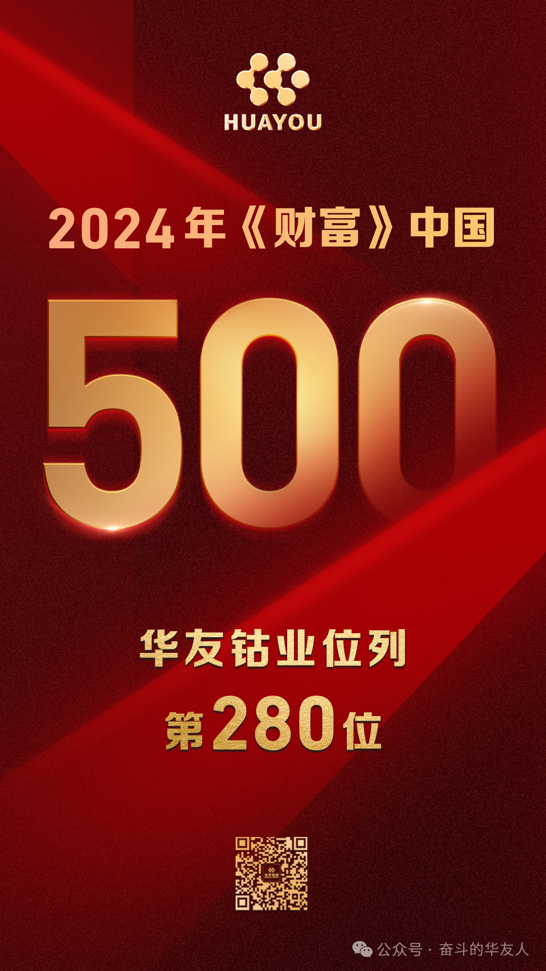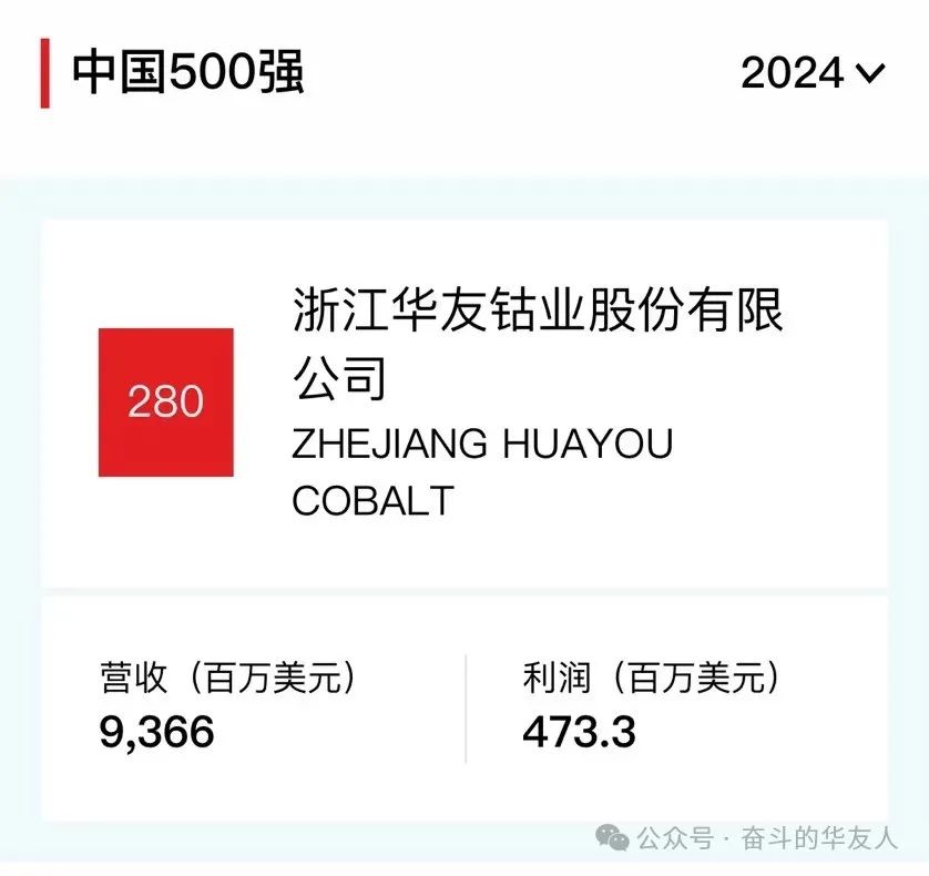 On 25 July, the 2024 Fortune China Top 500 list was unveiled, and Huayou Cobalt was ranked 280th on the list with a revenue of US$9.366 billion in 2023.