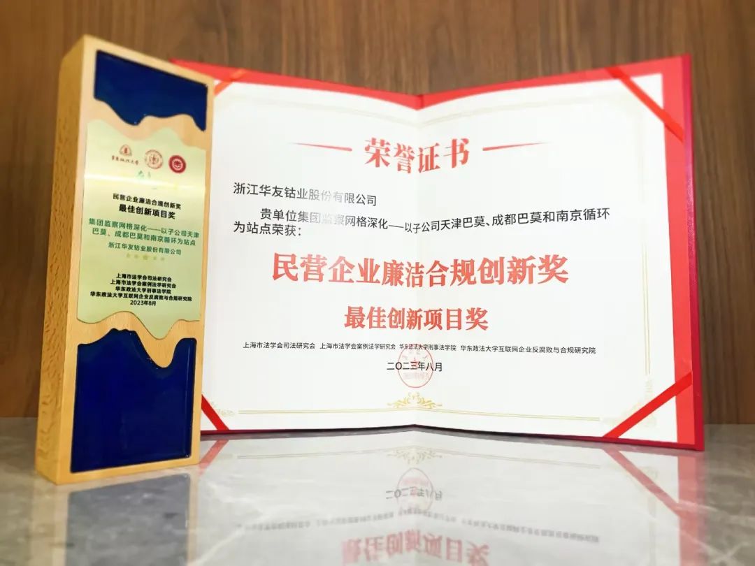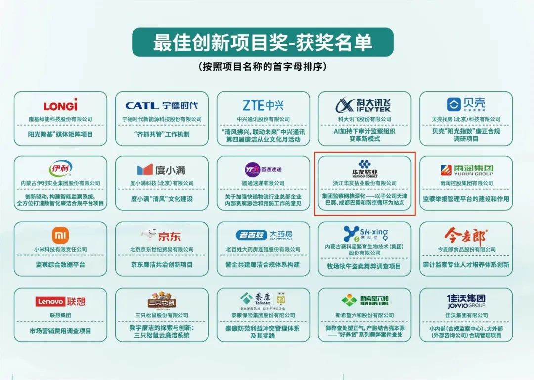 2023年8月3日,,,,,第二届“民营企业清廉合规立异奖”在华东政法大学长宁校区举行颁奖盛典,,,,,金沙js93252钴业监察网格深化项目荣获“最佳立异项目奖”奖项。。。