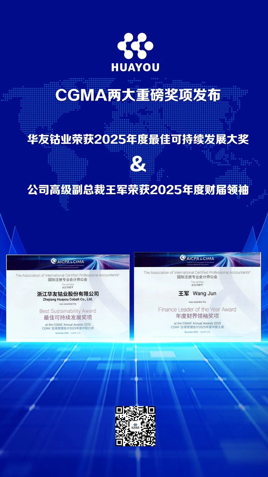 11月26日,,被誉为“财界奥斯卡”的CGMA全球治剖析计2025年度中国大奖暨CFO岑岭论坛在上海圆满落幕。。。。。金沙js93252钴业在盛会中一举摘得“年度财界首脑”与“最佳可一连生长奖”两项重量级大奖,,充分彰显了其在财务治理与可一连生长领域的行业领先职位。。。。。